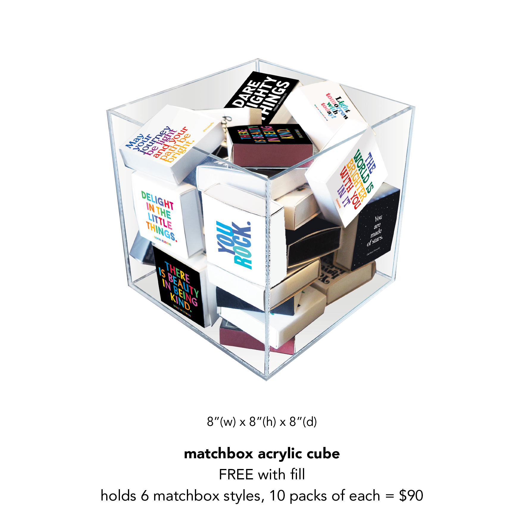 2 3/8" x 2 3/8" x 3/4" matchbox containing 80 black or natural wood matchsticks with coordinating color tips.